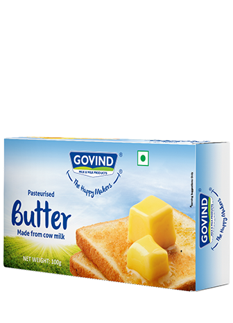 Govind Milk’s table butter makes every meal so much better! It’s made using thick and wholesome cream derived from our 100% pure and healthy cow’s milk. Relish this butter with toast, parathas, pav bhaji, or sandwiches, and give your loved ones a taste of indulgence. Our butter is light, luxurious, and preservative-free.